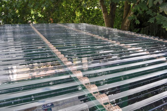 แผ่นโพลีคาร์บอเนตลูกฟูกมีน้ำหนักเบาและส่องผ่านได้สูง สำหรับแผ่นแบบโปร่งแสงการส่งผ่านแสงมากถึง 90% มันถูกใช้เป็นสกายไลท์ในอุตสาหกรรมการก่อสร้างเหล็ก วัสดุนี้ยังใช้สำหรับสภาพแวดล้อมของเรือนกระจกเนื่องจากทำความสะอาดได้ง่ายและไม่แตกหักง่าย