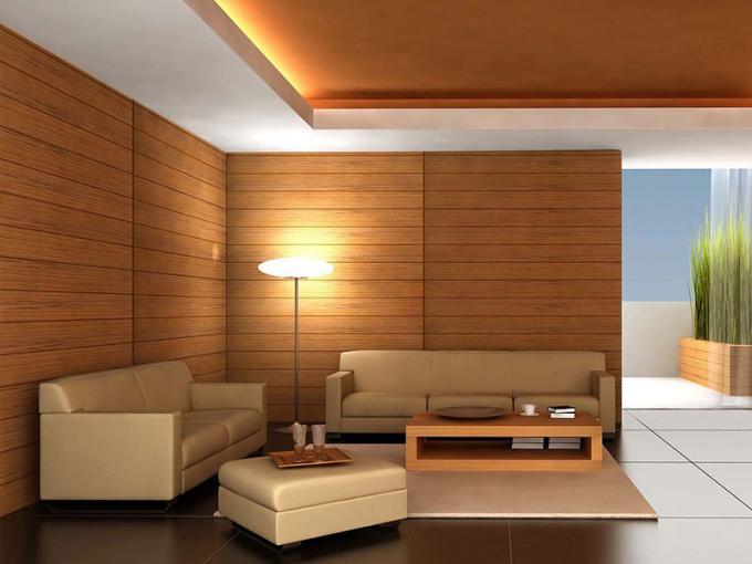 ห้องนั่งเล่นในภาพตกแต่งด้วยการออกแบบแผ่นลามิเนตไม้พีวีซีดูเหมือนว่าไม้จริง แต่ค่าใช้จ่ายถูกกว่าและง่ายกว่าการติดตั้งมากกว่าไม้ ง่ายต่อการทำความสะอาด